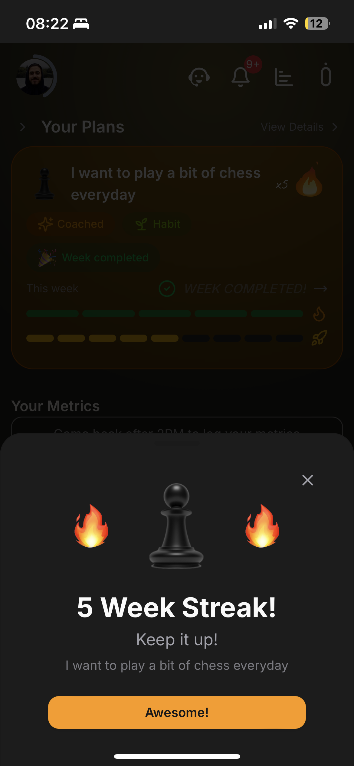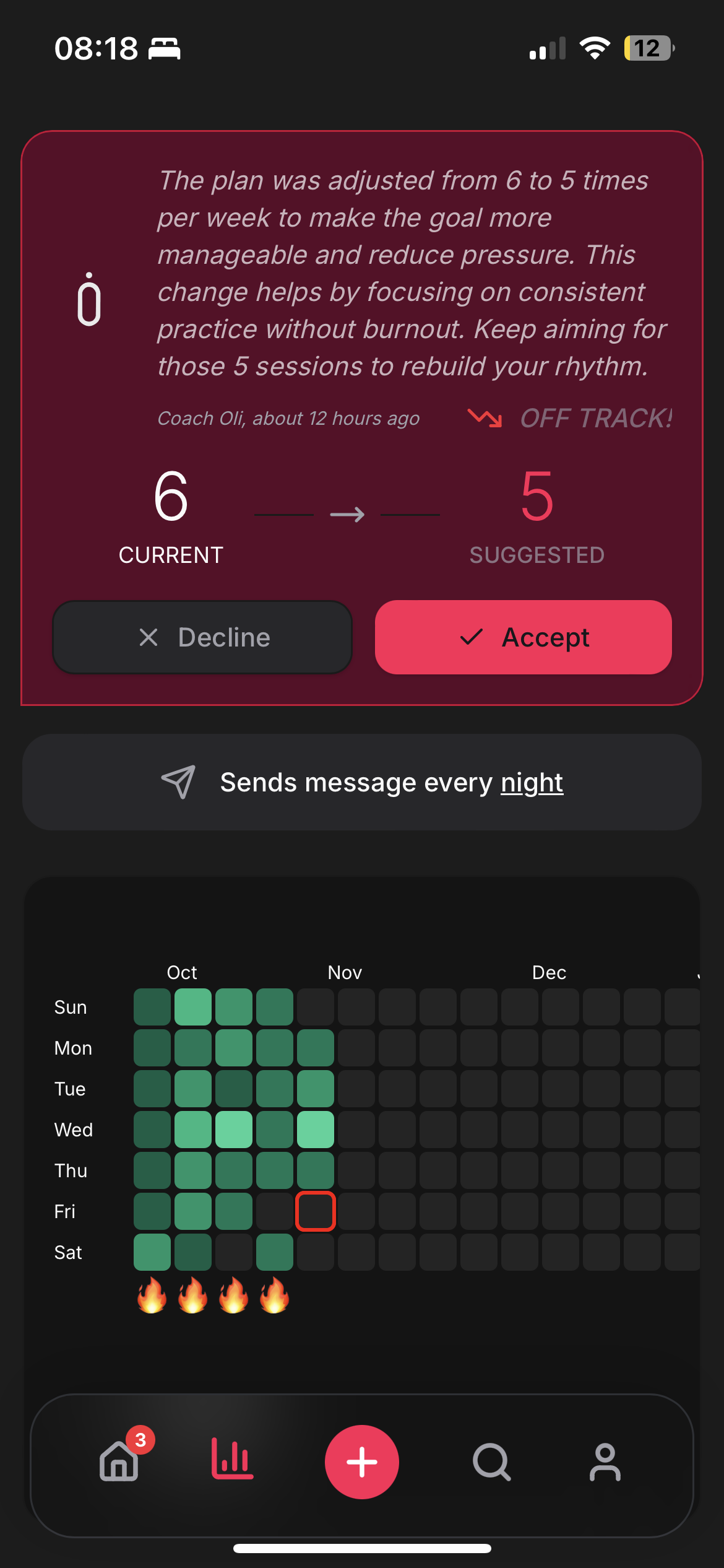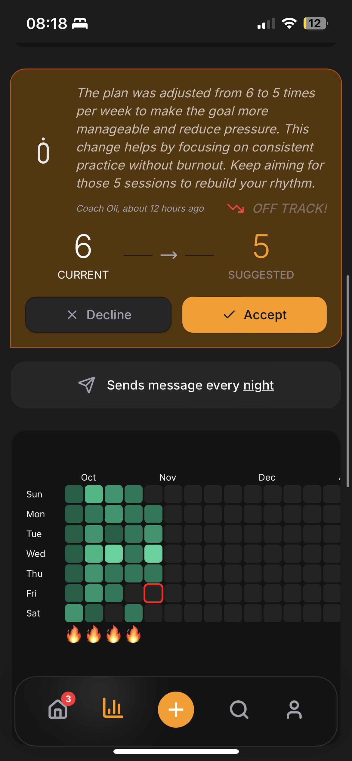 Coach proactively reaches out to you to remind you to stay on track, encourage you to log your metrics or with a new partner suggestion.