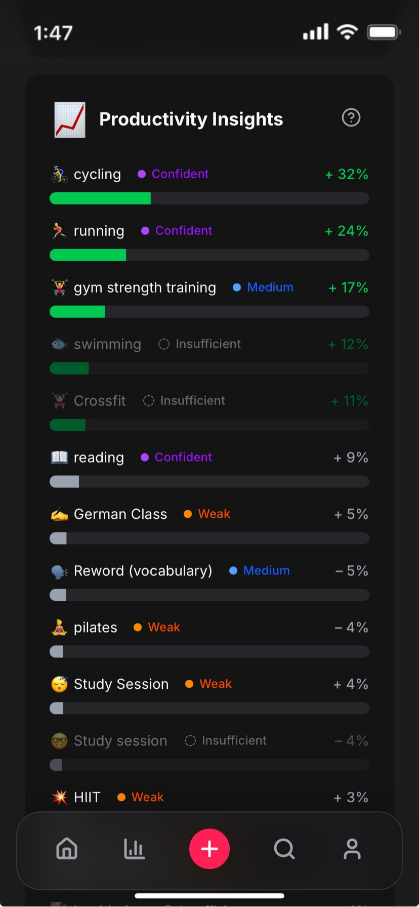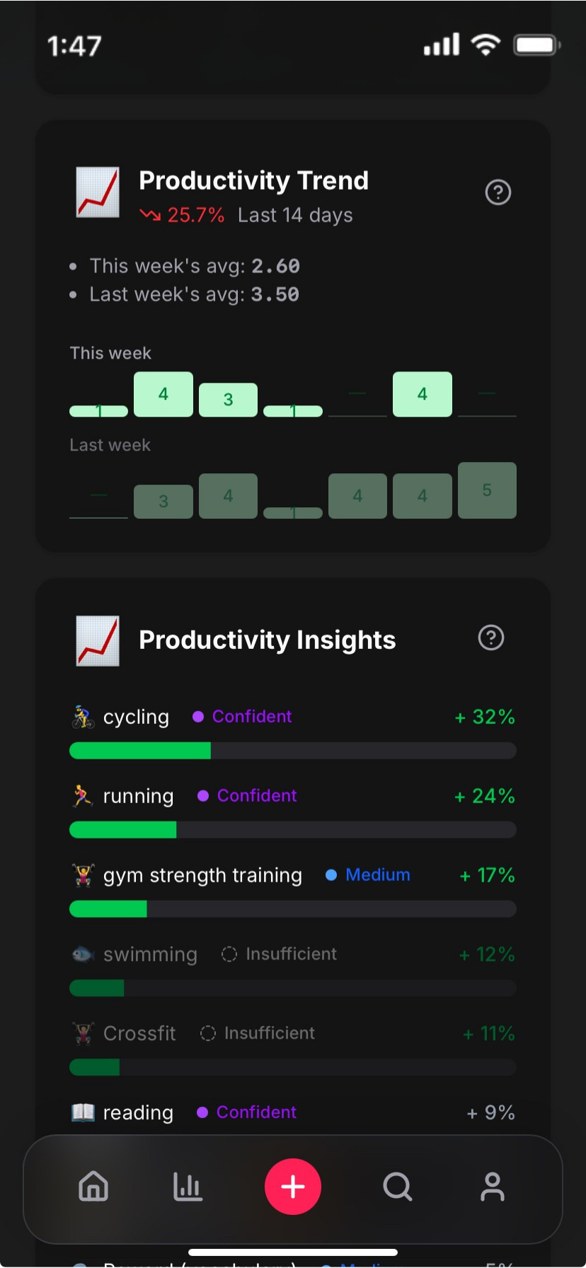 Automatically generate correlations based on your recorded metrics like mood, energy, productivity, and see how they relate to your routine.